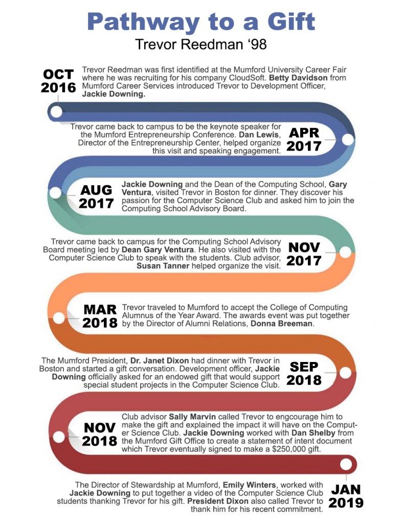 Enter the “Pathway to a Gift”—a visual representation that encapsulates the high-level engagements and contributions of the partners who paved the way to philanthropic success. This graphic narrative is then shared with all those mentioned within, serving as an acknowledgment of their support. The benefits from such recognition are as follows: