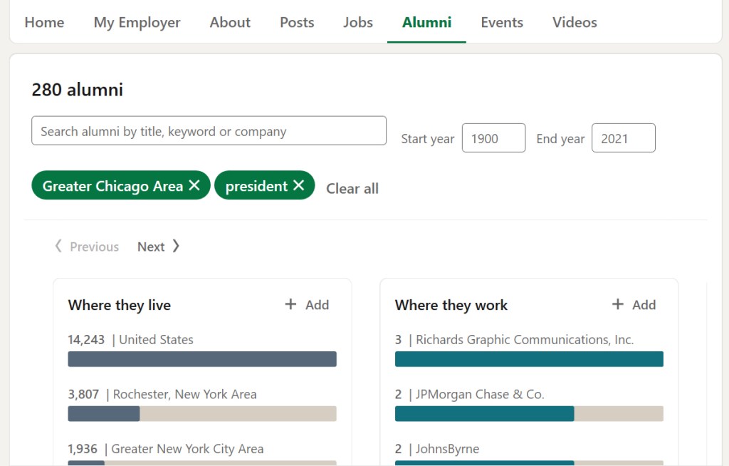 5. Harness the Power of LinkedIn: If you’re not already familiar with LinkedIn’s search function, it’s high time you become acquainted with it. This tool is a veritable goldmine. The user-friendly search function allows you to filter prospects based on specific criteria. Begin by inputting your university’s name in the search bar. Once on the university page, navigate to the alumni tab. From there, you can narrow your search based on their location, workplace, or even job titles. For instance, you can identify all alumni in Chicago with the job title “president.”