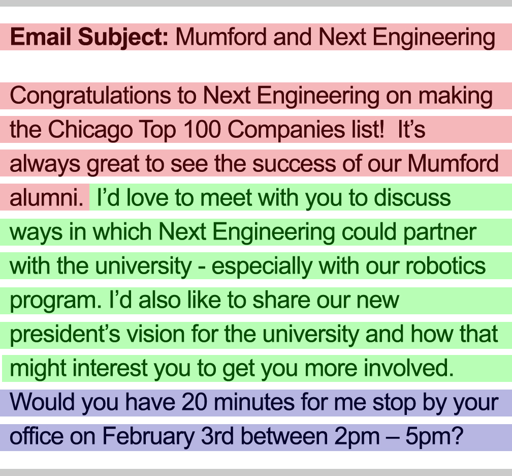 Having successfully drawn your prospect into your email’s content, your next mission is to concisely outline the specifics and advantages of meeting in the body of your message. The most potent benefits to highlight are those that align with your prospect’s personal interests and career pursuits. Craft your message in such a way that your prospect genuinely believes that the meeting you propose will be a rewarding and productive investment of their time. Essentially, your aim is to convey that this meeting is not just an obligation but an opportunity.